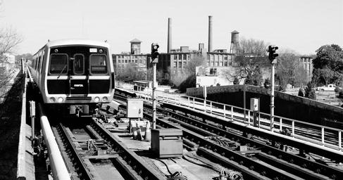Keywords: blackandwhite monochrome train vehicle outdoor sport black and white A westbound MARTA Green Line approaching the King Memorial Station. A westbound MARTA Green Line approaching the King Memorial Station.