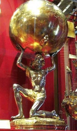 Keywords: Atlas-shaped vessel.jpg Artwork en Atlas-shaped vessel pl Naczynie w kształcie Atlasa Silver gilt cm 75 Moscow Kremlin Armoury en The surface of the globe was adorned with the effigies of the planetary gods Venus Diana Mercury Jupiter Saturn Mars and Apollo Object history ProvenanceEvent 1651 gift Aleksey Mikhailovich John II Casimir of Poland Warsaw own BurgererSF s 1620 Rudolf Lehmann Vilnius Other versions West-european tableware in the Museums of Moscow Kremlin Silverware in Russia Tableware from the Polish Vasa Collection Statues of Atlas Silver sculptures |