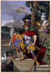 | Keywords: Atlas Van der Hagen-KW1049B11 001-ANGLIAE SCOTIAE HIBERNIAE et GERMANIA INFERIOR Sive XVII Provinciarum..jpeg of the Atlas Van der Hagen in the catalogue of the KB http //opc4 kb nl/DB 1/TTL 1/LNG EN/PPN PPN 353012750 Publisher Onbekend / unknown Publisher Onbekend / unknown credit line laatste kwart 17de eeuw Krijger in krijgstenu in een Romeinse tuin die een schild ophoudt in zijn linkerhand en een staf in zijn rechterhand Op de voorgrond van hem links een jongen met een mand met vissen en een zwaan Warrior dressed in armor in a Roman garden holding up a shield in his left hand and a staff in his right hand In front of him left a boy with a basket with fishes and a swan 44 x 29 5 cm exhibition history Institution Koninklijke Bibliotheek kopergravure Technique copper engraving KW1049B11_001; Volume 1; Information field Depicted locations England - Scotland - Ireland object history object type Prent Print PD-old-100 place of creation Amsterdam place of discovery Source page at the http //resolver kb nl/resolve urn urn gvn KONB01 114 Geheugen van Nederland / Memory of the Netherlands website Koninklijke Bibliotheek ANGLIAE SCOTIAE HIBERNIAE et GERMANIA INFERIOR Sive XVII Provinciarum Uploaded with GWToolset Atlas Van der Hagen-KW1049B11_001-ANGLIAE SCOTIAE HIBERNIAE et GERMANIA INFERIOR Sive XVII Provinciarum http //resolver kb nl/resolve urn urn gvn KONB01 1049B11_001 size large Atlas van der Hagen |