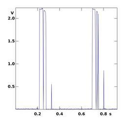 Keywords: ATmega8 ADC sampled “knocks” at 450 Hz rate.svg ADC at 450 Hz sampling rate The signal was picked up with a piezoelectric buzzer shunted with a 680 kΩ resistor used as a microphone and passed through an LM358-based unity gain amplifier for impedance matching reasons Own Ivan Shmakov 2014-06-08 <gallery mode packed > ATmega8 ADC sampled knocks at 450 Hz rate directly svg </gallery> ATmega8 Piezoelectricity Cc-zero |