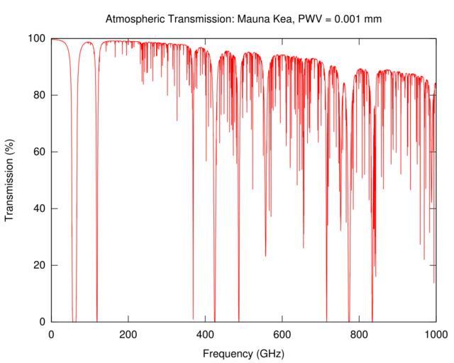 | Keywords: Atmospheric Microwave Transmittance at Mauna Kea (simulated).svg Mauna Kea in the Gigahertz range at a precipitable water vapor level of 0 001 mm Created using http //pastebin com/raw php i uZ3mmJTY data from the http //www submm caltech edu/cso/weather/ CSO Atmospheric Transmission Interactive Plotter at the submillimeter wave astronomy site of Caltech 2012-06-05 own Westeros91 gnuplot To create this plot I used gnuplot and the http //pastebin com/raw php i uZ3mmJTY data from the http //www submm caltech edu/cso/weather/ CSO Atmospheric Transmission Interactive Plotter at the submillimeter wave astronomy site of Caltech To reproduce use the following gnuplot code <source lang gnuplot > /usr/bin/env gnuplot set terminal/output file set terminal svg enhanced size 850 680 font Helvetica 16 set output Atmospheric Microwave Transmittance at Mauna Kea simulated svg set plot title set title Atmospheric Transmission Mauna Kea PWV \ 0 001 mm remove legend unset key set title set ylabel Transmission set xlabel Frequency GHz set x/y tics set xtics 200 set ytics 20 plot data txt plot data txt using 1 3 100 with lines </source> cc-zero Uploaded with UploadWizard Plots Technical diagrams |