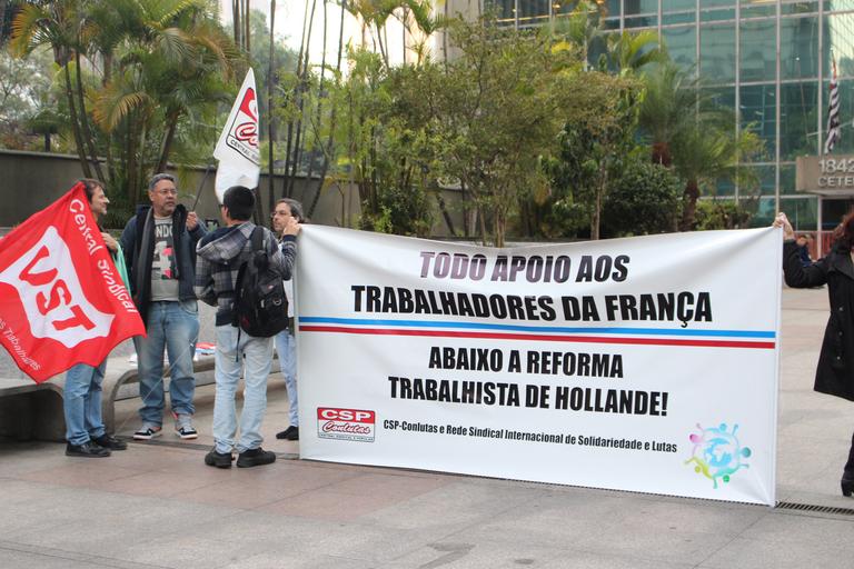 Keywords: Ato realizado em frente ao consulado geral da França, em apoio aos trabalhadores franceses em luta contra a reforma nas leis trabalhistas. As intervenções também denunciaram perseguições e criminalização de ativistas de diversos países.