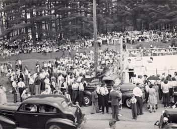 Keywords: 1947 lumberman's picnic lumbermanspicnic cloyne barrie hall barriehall crowd gathering event barbara ann scott barbaraannscott picnic lumberman lumbermen lumbermen's lumbermens The 1947 Lumbermen's Picnic in Cloyne was a roaring success with attendance figures ranging from 6,000 (Globe and Mail) to 12,000 (Toronto Evening Telegram) depending upon the reporting. A platform for speeches and dancing was erected to the north side of the old Barrie Hall. The Hall would be to the far right in this photograph. Many of the large pines in the background were lost to the microburst in 2002. The Pioneer Museum would be situated in the top left hand corner. One of the visiting dignitaries was Barbara Ann Scott pictured above sitting to the side of the old Barrie Hall in Cloyne. Barbara Ann had finished earlier in the year of capturing gold in both the European and World Ladies Figure Skating Championships. The 1947 Lumbermen's Picnic in Cloyne was a roaring success with attendance figures ranging from 6,000 (Globe and Mail) to 12,000 (Toronto Evening Telegram) depending upon the reporting. A platform for speeches and dancing was erected to the north side of the old Barrie Hall. The Hall would be to the far right in this photograph. Many of the large pines in the background were lost to the microburst in 2002. The Pioneer Museum would be situated in the top left hand corner. One of the visiting dignitaries was Barbara Ann Scott pictured above sitting to the side of the old Barrie Hall in Cloyne. Barbara Ann had finished earlier in the year of capturing gold in both the European and World Ladies Figure Skating Championships. |