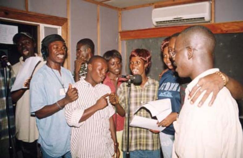 Keywords: Atunda Ayenda Cast.jpg en The cast of Atunda Ayenda a Sierra Leonean radio soap opera showing character actors including Alhaji Sesay third from the left Winstinia Johnson fifth from left Patricia Fallah Hollist centre by mike http //africaphotos usaid gov/search_details cfm Keyword_ID 239 Country_ID 28 Sector_ID 10 Photo_ID 1796 StartRow 256 Laura Lartigue 2004-06-08 PD-USGov-USAID PD-USGov Broadcasting People with microphones Actors from Sierra Leone Actresses from Sierra Leone |