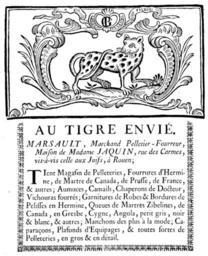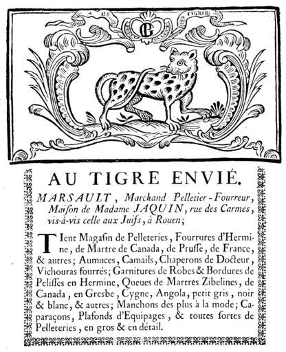 Keywords: Au Tigre Envié.jpg Au Tigre Envié MARSAULT Marchand Pelletier - Fourreur Maison de Madame JAQUIN rue de Carmes vis-à-vis celle aux Juifs à Rouen; Tient Magasin de Pelleteries Fourrures d'Hermine de Martre de Canada de Prusse de France autres; Amuces Camails Chaperons de Docteur Vichouras fourrés; Garnitures de Robes Bordures de Pelisses en Hermine Queues de Martres Zibelines de Canada en Gresbe Cygne Angola petit gris noir blanc autres; Manchons des plus à la mode; Caparaçons Plafonds d'Equipages toutes fortes de Pelleteries en gros en détail F 6 - Collection Housard Une enseigne bien caractéristique de l'extrême fin du XVIII<sup>e</sup> siècle et qui précise bien l'activuté des fourreurs de 1790 à 1815 Biblioth du Museée des Arts et Traditions Populaires - Doc cummuniqué par Mlle Marie-Louise Sarrabezolles Jean-H Prat Fourrure et Pelletiers A travers les ages Édition du Tigre Paris ca 1952 Page 244 / Collection G C Franke book between 1790 1815 author PD-old Fourrure et Pelletiers A travers les ages 244 Furriers in Rouen Marsault Fur fashion in 1802 Coats of arms of furriers Fur advertising Marsault Rue des Carmes Rouen Musée des Arts et Traditions populaires |