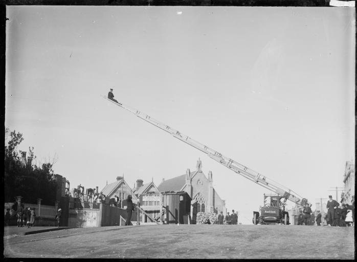 Keywords: fire ladder fireladder fire department firedepartment fire brigade firebrigade firefighter firefighters blackandwhite monochrome outdoor photo border black and white The Auckland Fire Brigade at drill in Beresford Street using the 85 foot Simon's ladder. A fireman is sitting on the end of the ladder as it is being lowered to the ground. Other firemen and onlookers are standing on the street watching. Pitt Street Methodist Church is in the background. The construction site shed of J T Julian & Son, contractors, with a pile of rubble behind, can be seen in the middle foreground. Builders are working on the construction site to the left. Photograph taken by William A Price in 1912. Quantity: 1 b&w original negative(s). Physical Description: Dry plate glass negative 4.75 x 6.5 inches Auckland Fire Brigade at drill. Price, William Archer, 1866-1948 :Collection of post card negatives. Ref: 1/2-001832-G. Alexander Turnbull Library, Wellington, New Zealand. natlib.govt.nz/records/22787269 The Auckland Fire Brigade at drill in Beresford Street using the 85 foot Simon's ladder. A fireman is sitting on the end of the ladder as it is being lowered to the ground. Other firemen and onlookers are standing on the street watching. Pitt Street Methodist Church is in the background. The construction site shed of J T Julian & Son, contractors, with a pile of rubble behind, can be seen in the middle foreground. Builders are working on the construction site to the left. Photograph taken by William A Price in 1912. Quantity: 1 b&w original negative(s). Physical Description: Dry plate glass negative 4.75 x 6.5 inches Auckland Fire Brigade at drill. Price, William Archer, 1866-1948 :Collection of post card negatives. Ref: 1/2-001832-G. Alexander Turnbull Library, Wellington, New Zealand. natlib.govt.nz/records/22787269