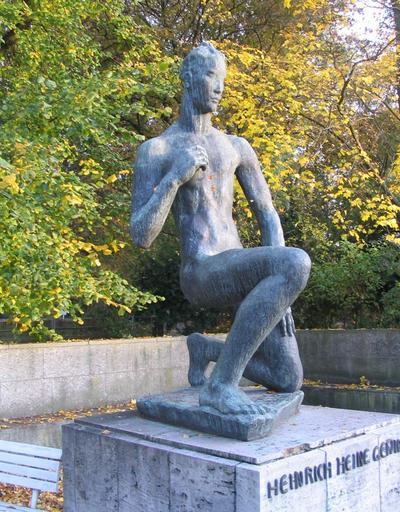 | Keywords: Aufsteigender Jüngling, Düsseldorf Ehrenhof 2011 (2).jpg Georg Kolbe Aufsteigender Jüngling Düsseldorf Ehrenhof 1931 schrieb die Stadt Düsseldorf einen Wettbewerb für ein den Bürgern schon lange versprochenes Heinrich-Heine-Denkmal aus aufzustellen im Ehrenhof Den Wettbewerb gewann der Berliner Künstler Georg Kolbe vor Arno Breker und Johannes Knubel Nach zwei Jahren intensiver Arbeit an dem doppelt mannshohen Denkmal hatten sich die politischen Verhältnisse so sehr geändert dass ein Denkmal zu Ehren des Juden Heine nicht mehr denkbar war der bereits zweite sehr späte Versuch für ein Düsseldorfer Heinedenkmal war damit ebenfalls für lange Zeit gescheitert Man platzierte den knienden Aufsteigenden Jüngling der nicht Heine zeigt sondern menschliches Streben und Mühen versinnbildlicht im Vestibül des Hetjens-Museums das sich damals noch im Ehrenhof befand Von dort kam er nach dem Krieg ins Kunstmuseum 1949 endlich auf einem neu geschlagenen Sockel aus Muschelkalk an die dafür vorgesehene Stelle auf der östlichen Seite des Ehrenhofs immer noch ohne den Hinweis auf Heine 1953 entstand stattdessen eine Heine-Gedenkstätte im Hofgarten 1981 schuf Bert Gerresheim das Heine-Monument am Rand der Parkanlage Schwanenmarkt Seit 2002 weist inzwischen eine erklärende Plakette und eine Inschrift auf den Zusammenhang vom žAufsteigenden Jüngling zu Heine hin Das gespaltene Verhältnis Düsseldorfs zur Ehrung Heines war auch im Zusammenhang mit den Querelen um die Heine-Denkmäler immer wieder Mittelpunkt öffentlicher Diskussion Ein weiteres Werk Kolbes der Stehende Jüngling ist wenige hundert Meter nördlich in der Kaiserswerther Straße 137 vor dem Drahthaus aufgestellt own 2011-10-29 Kürschner <span class signature-talk >talk</span> 08 05 30 October 2011 UTC Kürschner <gallery> File Aufsteigender Jüngling Düsseldorf Ehrenhof 2011 1 jpg </gallery> FoP-Germany Aufsteigender Jüngling Georg Kolbe |