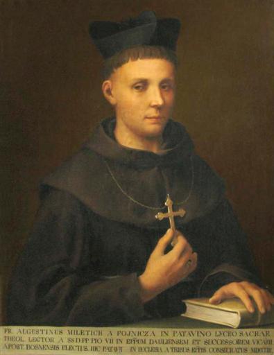 | Keywords: Augustin Miletić2.png Uploaded with en wp UW marker 2015 07 06 Portrait of Bishop Augustin Miletić Fra Augustin Miletić 1763 - 1831 was a Franciscan friar and Apostolic Vicar from Bosnia and Herzegovina The portrait shows Bishop Miletić in half-figure against a dark background The bishop is wearing a habit with a black cap on his head and a gold cross around his neck which he is holding in his right hand He is holding a book in his left hand Original publication Unknown<br/> Immediate source http //www fojnica-samostan com/fojnicka_skrinja/Fojnicka_skrinja_broj_23 pdf 1803 more information about this portrait http //www kons gov ba/main php id_struct 50 lang 4 action view id 2496 author The original portrait of Bishop Miletić after which this portrait was painted dates from 1803 when Miletić was appointed as bishop The original was in the Franciscan monastery in Tolisa It is not known who painted the original portrait but Saitz is known to have painted this one after it Information acquired in the Franciscan monastery in Fojnica More about that from Bosnia and Herzegovina Commision to Preserve National Monuments Museum collection and Library holdings of the Franciscan monastery of the Holy Ghost the movable property http //www kons gov ba/main php id_struct 50 lang 4 action view id 2496 PD-old-70-1923 Franciscans in Bosnia and Herzegovina |