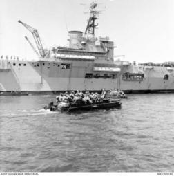 Keywords: Australian soldiers ferried in small craft to guard Sabah (AWM NAVY05185).JPG en Australian soldiers are being ferried in a small craft possibly a DUKW near the troop transport HMAS Sydney on its arrival in North Borneo Sabah The ship was carrying army units and their equipment to Malaysia under Australia's increased Defence aid program The men are probably members of the 7th Field Squadron or 111 LAA Battery NAVY05185 author 1964-06 PD-Australia Indonesia-Malaysia confrontation Military history of Australia during the Indonesia “Malaysia Confrontation HMAS Sydney R17 |