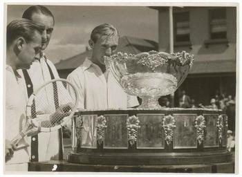 Keywords: davis cup, 1939 daviscup1939 sam hood samhood davis cup daviscup john bromwich johnbromwich adrian quist adrianquist tennis merion cricket club merioncricketclub pratten park prattenpark photo border monochrome Australians John Bromwich and Adrian Quist won the final of the Davis Cup at the Merion Cricket Club in Haverford, PA, United States on 2-5 September 1939, against a team of four Americans. To 2011, the United States had won the Davis Cup 32 times, Australia 28 times and Great Britain and France 9 times each. Today the base of the Cup is much higher to accommodate all the winners' plates Format: Photograph Find more detailed information about this photographic collection: acms.sl.nsw.gov.au/item/itemDetailPaged.aspx?itemID=153771 From the collection of the State Library of New South Wales : www.sl.nsw.gov.au/ Australians John Bromwich and Adrian Quist won the final of the Davis Cup at the Merion Cricket Club in Haverford, PA, United States on 2-5 September 1939, against a team of four Americans. To 2011, the United States had won the Davis Cup 32 times, Australia 28 times and Great Britain and France 9 times each. Today the base of the Cup is much higher to accommodate all the winners' plates Format: Photograph Find more detailed information about this photographic collection: acms.sl.nsw.gov.au/item/itemDetailPaged.aspx?itemID=153771 From the collection of the State Library of New South Wales : www.sl.nsw.gov.au/ |