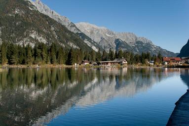Keywords: austria mountains sky clouds lake water houses homes shoreline forest trees woods reflections blue beautiful fall autumn nature outside country countryside scenic