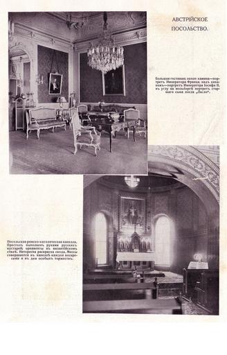 | Keywords: Austrian Embassy Sergievskaya 1914 4.jpg en Large living room and chapel of Austrian Embassy in St Petersburg // «Stolitsa i Usad'ba» Magazine 1914 «Austrian Embassy in St Petersburg» article ru Большая гостинная и капелла в здании Авст о-Венге ского посольства в Санкт-Пете бу ге // «Столица и усадьба» 1914 ст 13 Статья «Авст ийское посольство в Санкт-Пете бу ге» digitized by Lev Zharzhevsky оциф овал Л Жа жевский author 1914 Austrian Embassy Sergievskaya 1914 4b Large living room jpg Austrian Embassy Sergievskaya 1914 4b Large living room jpg Austrian Embassy Sergievskaya 1914 4a Chapel jpg Austrian Embassy Sergievskaya 1914 4a Chapel jpg PD-RusEmpire Austro-Hungarian Embassy in Saint Petersburg 1914 in Saint Petersburg Stolitsa i Usad'ba magazine 1914 Harald Julius von Bosse |