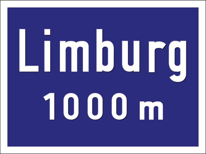 Keywords: Autobahnausfahrt-Ankündigungstafel - 1000 m - Limburg.svg de Autobahnausfahrt-Ankündigungstafel - 1000 m à ber einem sehr guten Photo das fast nicht weiter entzerrt werden mußte nachgezeichnet Wie damals üblich waren die Tafeln handgemalt Daher weicht die Typographie in sich etwas von den Normbuchstaben ab Ungewöhnlicherweise waren die typographischen Zeichen in diesem Fall leicht erhaben dargestellt und wohl in Sperrholz gefertigt Die Tafel war zum Zeitpunkt der Aufnahme im Frühjahr 1945 bereits etwas älter Bei zwei der dargestellten Buchstaben - jeweils das žm - war irgendwann die plastisch ausgeführte Version abhanden gekommen Statt eine neue erhabene Ausführung anzubringen waren an den Leerstellen die beiden fehlenden Buchstaben sorgfältig auf die Tafel gemalt worden Quelle Times Magazin 1945 motorisierte Soldaten der 2 US-Infanteriedivision auf der Autobahn own selbst gezeichnet durch Mediatus Mediatus 22 März 2016 Herstellungsdatum + Signs User Mediatus/no-new-version Cc-zero PD-VzKat Diagrams of motorway road signs of Germany 1938 set SVG road signs in Germany Reichsautobahn signs |