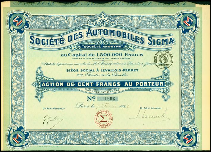 Keywords: Automobiles Sigma 1921.jpg de Aktie über 100 Francs der Automobiles Sigma SA vom 7 Februar 1921 1921-02-07 Sammlung eines Mitglieds des Ersten Deutschen Historic-Actien-Clubs e V EDHAC e V ; le Edhac-Edham other versions PD-old-70-1923 Bonds and Shares of EDHAC members Sigma France vehicles |