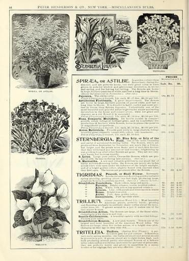 | Keywords: Autumn bulbs catalogue (16425966526).jpg 44 <br> PfiTER HENDIiRSOX CO NJ-W YORK ” MISCi;i I AN' orS BUI RS <br> TBITELEIA <br> 8PIB EA OR ASTILBE <br> C PIP/FA HD A' TII RF In Kardemnlturt- these <br> suniiner and are pertectly hardy Imt tlieir yreat vaim is when <br> grown in pots for window and grwnliouse decoration in wir ter <br> and spring and for forcing for cutting Tlie flowers are borne <br> in lar ie featliery jjanicles of wliite and last a long time in bloom <br> I Really for sliiiJinHnt in Xoyejuber See cut <br> Japonica Tlie old favorite <br> I'ricrs ifhiiyfT pnys trnuMt 12c each 1 J doz 6 00 per 100 <br> Astilboides Ploribnnda A great inipiovenient The flowers <br> are home in large feathery i antcles of purest white and last a <br> long time in bloom It is dwarfer in hahil earlier and niorv iro- <br> liise in bloom than Spii-;va Japonica I'ndoulm'dly one of the <br> most beautifnl and graceful sulijects grown for winter and spring <br> de -oration in the house and conservatory while for grace and <br> elegance as a cut flower it is unequaled <br> Prices ifliuyfr Kiys tninsil l c each 1 lO doz fli OO per 100 <br> ITaua Compacta Uultiflora Its merits consist in compact <br> growth ample foliage of brilliant green and its wonderfully free <br> production of fe ithf r v white flowers borne in lume-like panicles <br> of magniflient proportions <br> Prires ifbiiyiTp iys tr insit inc each 1 0 doz ' » 00 i er 100 <br> Aorea Beticulata Flowers pure white in large clusters foliage <br> beautifnl green elegantlv veined with vellow ver v handsome <br> Prizes if buyer pays trausit 15c each 1 0 doz <br> QTPDMRPDni A – tna tily or tily of the <br> O 1 II K1 I Dt- I\ VJI/A rield tine i ih ' niONt charmin- <br> anil iisrinl – – I aiit iininal-llowerin ' Ipnil s The flowers which an- <br> prodiii ed from September to November are nuich like a Croius <br> but larger and the petals more fleshy and of snch firm te \tuiv <br> that they withstand any amount of bad weather brightening up <br> our gnriiens long after other flowers are gone They are not only <br> very h ird v but increase rapidl v <br> S IiUtea Largi' pure rellow Crocus-like flowers which are pro- <br> duced with the leaves during late autumn SeecHf <br> S Macrantha \ new and valuable addition to our small list of <br> hardy antuTun-flowering bulbs the flowers are nearl v six inches <br> across when wide open under the influence of the bright suidlght <br> and of a liright golden yellow slightly fl iked with emerald when <br> the v first open The leaves ai-e produced After the flowers <br> nri/ OI pvl A C Peacock or Shell Plower Extn-mely <br> ¢ IvJ IVl Lf lr\0 li ui l - ome suiunicT-ll iuriiiig - irilen luilbsfor <br> -priiig iil iniing growing -ihout two te t high pr alucing large <br> giirgeouK tl i eis e\ uisitely spotted I See iiil I /iV -ii/ c ill \ iv <br> Grandiflora Conchiflora Dark yellow large red spots <br> Pavonia liright crimson ceutit- mottled yellow <br> Alba White with yellow cup spotted crimson <br> Lilacea I ilac with purpleaiid whitespols In centre <br> Rosea Uright rose-iiink <br> Aurea I'ni-e deep golden vellow <br> Imniacnlata Pure spotless white <br> – ypil I Iltri idre it Amerir in Woixl I ily Most beautiful <br> I Iv ' I ” ' L ' - ' – ¢ \mericnn plants i erfeitly hard \ growing <br> mil lli weritiL' profusely in partisilly shady nimks about the lawn <br> nii ler tne eti l grown several In a pot It makes one of the <br> I est uiiiler flowers <br> Grandiflorum Album The flowers are large of the finest white <br> cliiUiuinu in a few ilays to soft rose <br> Sessile Californicum A beautiful variety with mottled follngt- <br> I'lowi'rs pure \\hite <br> Grandiflortim Roseiini A lu-w pink variety This Is one of the <br> largest and most be inllfnl of the \nu-rican Wood Miles The <br> llo«ei- s iie laiire ofien tive inclic-s across of a bright rosy pink <br> ilian in« i s they ate lo dii'p wine red <br> XDITPI PI A Uniflora Sprinfc St ir Flowir V iwr- <br> i tV' I I- L L I/A f liiiiegrm for pot rultlin- It flowers hi <br> very early spring mouths ihe bulbs aresniall and several shoidd <br> Im' grown in a pot It grows about six lo eight Inches high each <br> bulb producing several ju-ctty stnr-shapeil flowiMS of a delicate <br> ndlky while suffused Hilh bbie andejulis Ihe iM-rf- ime of prlmroM 's; <br> thev are Krfi' lly hardy ami grown In ipiantltles In a sunny <br> border or for edglngn ihey an- very eftiiilve i see cut i <br> PRICES <br> DeiireriU Viee m U S <br> Each Doz 100 <br> 18c <br> 20c <br> 20c <br> 20c <br> 1 75 <br> 2 50 <br> 2 00 <br> 2 00 <br> iO 2 00 <br> 4 00 <br> 6c <br> 6o <br> He <br> c <br> 60 <br> 60 <br> 5c <br> lOe <br> 13c <br> 4 00 <br> 4 00 <br> 60 4 on <br> 60 4 00 <br> 7 5 K <br> 73' 3i 00 <br> 731 3 00 <br> 30 <br> a 00 <br> 1 00 <br> 0 00 <br> 1 10 <br> 0 00 43899756 149965 78524 Page 44 Text http //www biodiversitylibrary org/page/43899756 1900 10 5962/bhl title 78524 Henry G Gilbert Nursery and Seed Trade Catalog Collection ; Peter Henderson Co NameFound Astilbe NameConfirmed Astilbe EOLID 11171526 NameBankID 2649623 NameFound Astilboides NameConfirmed Astilboides EOLID 2886988 NameBankID 1812470 NameFound Californicum NameFound Compacta NameConfirmed Compacta EOLID 10934908 NameBankID 2627020 NameFound Croius NameFound Grandiflora NameFound Grandiflorum NameFound I ilac NameFound Pavonia NameConfirmed Pavonia Cav EOLID 61666 NameFound Roseiini Biodiversity Heritage Library Autumn bulbs catalogue 1900 Garden Stories Bulbs Plants Catalogs Equipment and supplies Flowers Gardening Seeds Trade catalogues U S Department of Agriculture National Agricultural Library bhl page 43899756 dc identifier http //biodiversitylibrary org/page/43899756 Peter Henderson Co bhlGardenStories Spirea Sternbergia Tigridias Trillium Triteleia BHLinbloom bulbs plants u s department of agriculture national agricultural library peter henderson co bhlgardenstories bhlinbloom Informat