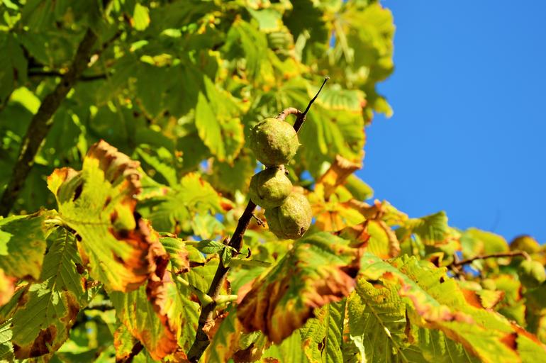 Keywords: autumn chestnut tree leaves green nature blue sky prickly road discolored chestnut leaves