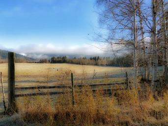 Keywords: autumn fall trees yellow colored landscape scenery season nature golden beautiful farm land clouds sky scenic fence meadow