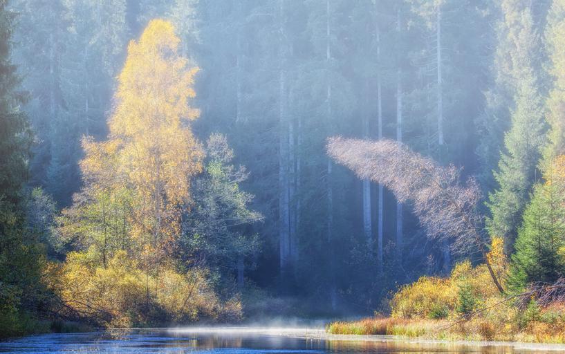 Keywords: autumn fog forest morning morgenstimmung back light lake mood fall foliage fall color yellow green black forest