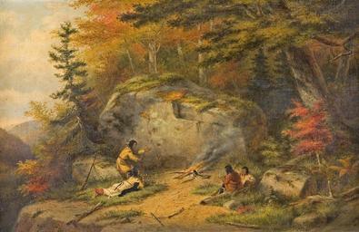 Keywords: 'Autumn in West Canada, Chippeway Indians', oil painting by Cornelius Krieghoff, 1865.jpg title Autumn in West Canada Chippeway Indians http //www bonhams com/auctions/16913/lot/52/ Bonhams Toronto 2 Dez 2008 lot 52 creator Cornelius Krieghoff oil canvas cm 35 6 55 5 C Krieghoff 65 ~ signature/date lower right langswitch auf dem Spannrahmen on the stretcher object history Loetitia Paul nee Marshall 1835-1932 of Teignmouth and Barnstable Devon England <br/>Inherited by her nephew Commander Edward Tierney Marshall RN and then by descent to his daughter Joan Marshall Henderson in 1955 <br/>By family descent to the present owner in England 1865 PD-old-100-1923 DEFAULTSORT Krieghoff Cornelius; Native Americans; Bonhams 2008 Landscape paintings by Cornelius Krieghoff Paintings of Native Americans by Cornelius Krieghoff Ojibwa 1865 paintings Images from Bonhams |