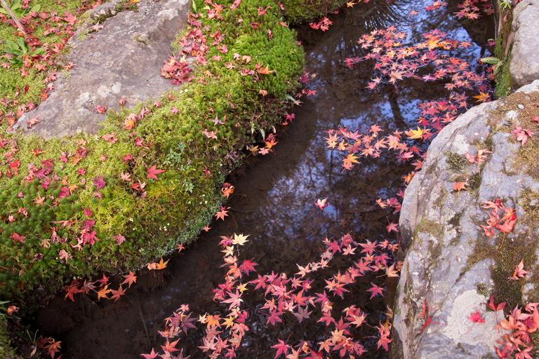 Keywords: autumnal leaves leaf moss maple water surface river water flow