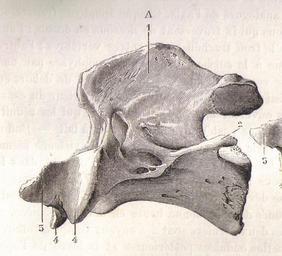 | Keywords: AxisChevalChauveau1890.jpg en Lateral view of the axis bone of a horse Equus caballus fr Vue latérale d'un axis Axis de cheval Equus caballus <br /> 1 processus épineux apophyse épineuse <br /> 2 processus transverse apophyse transverse <br /> 3 dent de l'axis apophyse odontoïde Dens axis <br /> 4 expansions latérales de la surface articulaire crâniale facettes articulaires latérales <br /> ” Chauveau Auguste Arloing Saturnin Traité d'anatomie comparée des animaux domestiques 1 064 p page 32 1890 Paris Lib J B Baillière et Fils domaine public décès des auteurs 1917 et 1911 Meyer C 2011-03-11 PD-old Auguste Chauveau Horse bones |