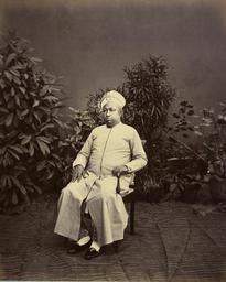 | Keywords: Ayilyam Thirunal Rama Varma of Travancore 1875.jpg en Photograph of the Maharaja of Travancore seated in an armchair facing half to the left with left hand on arm of chair He wears a long tunic with high neck long sleeves and a spotted lining; a turban with jewelled ornament Plants in pots behind 2701669 Calcutta Bombay Simla Bourne Shepherd active 1864-1900s photographer 1875 1876 Ayilyam Thirunal PD-old-100 | ||||