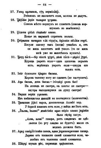 Keywords: Azerbaijani proverbs 64.jpg en Page with Azerbaijani proverbs written by Alexander Kalashev from the words of Hasan Kerimov inhabitant of Yelizavetpol town nowadays Ganja Сбо ник мате иалов для описания местностей и племен Кавказа Выпуск восемнадцатый Отдел II Ст 64 Azerbaijani proverbs written by Alexander Kalashev from the words of Hasan Kerimov 1894 PD-old Azerbaijani proverbs Azerbaijani manuscripts
