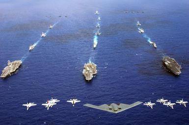 Keywords: B-2 leading Valiant Shield.jpg USS Kitty Hawk USS Ronald Reagan and USS Abraham Lincoln carrier strike groups in the western Pacific Ocean on Sunday June 18 to kick off Exercise Valiant Shield 2006 The joint exercise consists of 28 naval vessels more than 300 aircraft and approximately 20 000 servicemembers 2006-06-18 http //www af mil/shared/media/photodb/photos/060618-N-8492C-912 jpg DoD photo/Photographer's Mate 3rd Class Jarod Hodge PD-USGov-Military-Navy B-2 Spirit in flight Military of the United States Mixed aircraft formations General views of USS Ronald Reagan CVN-76 350 Valiant Shield 2006 General views of USS Abraham Lincoln CVN-72 General views of USS Kitty Hawk CV-63 |