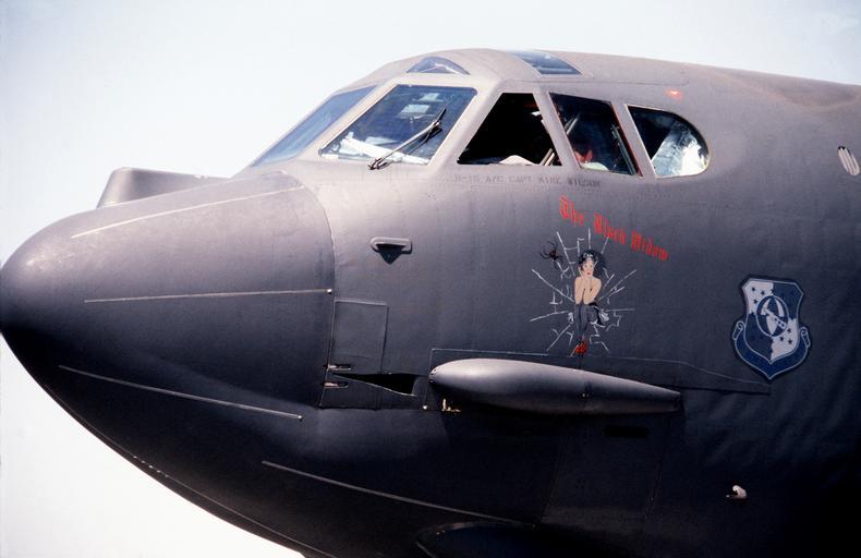 | Keywords: B-52H The Black Widow Nose Art.jpeg en A view of nose art entitled The Black Widow on a 410th Bombardment Wing B-52H Stratofortress aircraft at Mountain Home Air Force Base Idaho The plane is undergoing a preflight check prior to taking part in exercise Mighty Warrior '88 1988-08-11 NARA-image 6462602 SSGT Kevin Hoeth PD-USGov Nose art on B-52 |