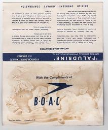 Keywords: boac drug medicine malaria ant-malaria antmalaria prophylactic customer service customerservice aviation airline seat back contents seatbackcontents airliner vintage advertising slogan boac takes good care of you boactakesgoodcareofyou british british overseas airways corporation britishoverseasairwayscorporation ephemera memorabilia biography autobiography drugs proguanil placebo hydrochloride In 1956, when I was 12 years old, I flew quite often alone. I had a small paper label on string around my neck which read, "Unaccompanied Minor". And indeed I was unaccompanied, since more often than not other passenger sat beside me and only other children, if any, would speak with me. I kept anything of interest that was in the seatback pocket in front of me. For example, this packet of "Paludrine" tablets. One packet was in each of the seatbacks of a BOAC DC4-M "Argonaut" flight which terminated in Rangoon, Burma. I was of sufficient intelligence to know that one does not chew pills as if they were complimentary candy. Even so, though, as a grown-up I now see that the dosage (0.1mg) is so low that they are more a "Takes Good Care of You" promotion than a drug. In 1956, when I was 12 years old, I flew quite often alone. I had a small paper label on string around my neck which read, "Unaccompanied Minor". And indeed I was unaccompanied, since more often than not other passenger sat beside me and only other children, if any, would speak with me. I kept anything of interest that was in the seatback pocket in front of me. For example, this packet of "Paludrine" tablets. One packet was in each of the seatbacks of a BOAC DC4-M "Argonaut" flight which terminated in Rangoon, Burma. I was of sufficient intelligence to know that one does not chew pills as if they were complimentary candy. Even so, though, as a grown-up I now see that the dosage (0.1mg) is so low that they are more a "Takes Good Care of You" promotion than a drug. |