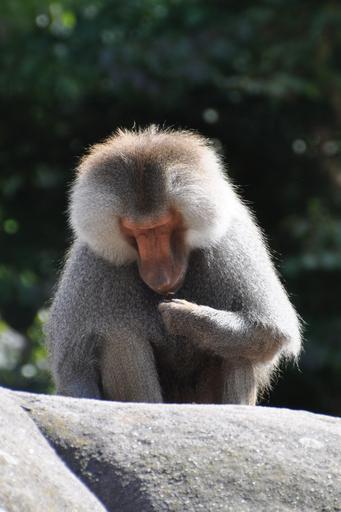 Keywords: baboon monkey animal sit examine grey zoo