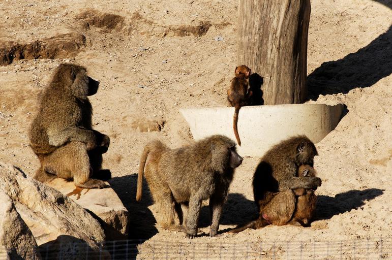 Keywords: baboon young animals family sand rock enclosure animal zoo