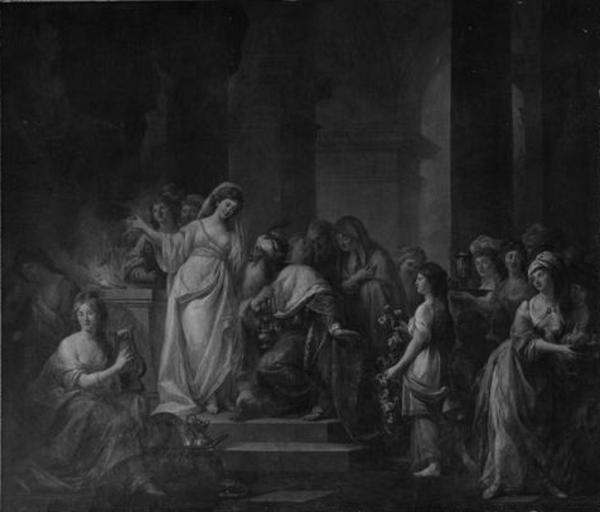 Keywords: Bacciarelli Dedication of the Temple.jpg Dedication of the Temple Poświęcenie świątyni Creator Marcello Bacciarelli 1788-1791 oil canvas Marek Kwiatkowski 1973 Łazienki Państwowe Wydawnictwo Naukowe The painting was one of a series History of Solomon painted to embellish the so-called Solomon Room in the Palace on the Water in Warsaw All the paintings were deliberately and completely destroyed by the Germans in 1944 burned in a campfire during the preparations to blow up the palace<ref name lazienki > cite web http //www lazienki-krolewskie pl/content/view/147/210/lang pl/ Sala Salomona - Palac na Wyspie Muzeum Łazienki Królewskie Royal Baths Museum 2010-02-19 </ref> see Planned destruction of Warsaw Object history PD-Art PD-old-100 References Reflist Paintings by Marcello Bacciarelli Paintings destroyed in Poland during World War II Temple of Solomon Solomon Room in the Palace on the Water |