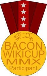 Keywords: Bacon WikiCup 2010 Medal.svg A medal awarded to all participants in the Bacon WikiCup 2010 an event that occurred during the Bacon Challenge 2010 own / Derived from Crudeboar svg Public Domain 2010-03-13 Kevin Payravi Wikimedia Commons Inkscape 2010 medals SVG medals |