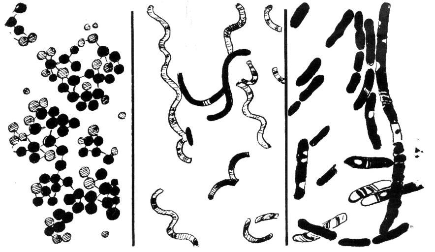 Keywords: Bacteria (PSF).jpg Line art drawing of bacteria; from left to right cocci spirilla bacilli Dessin de bactéries De gauche à droite cocci spirilla bacilli Bacteria diagrams