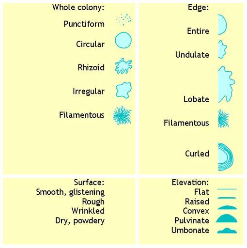 Keywords: Bacterial colony morphology.png Adapted and redrawn from Seeley HW Vandemark PJ 1962 Microbes In Action A laboratory manual of microbiology WH Freeman San Francisco London 2007-01-09 own assumed Ewen Microbiological cultures