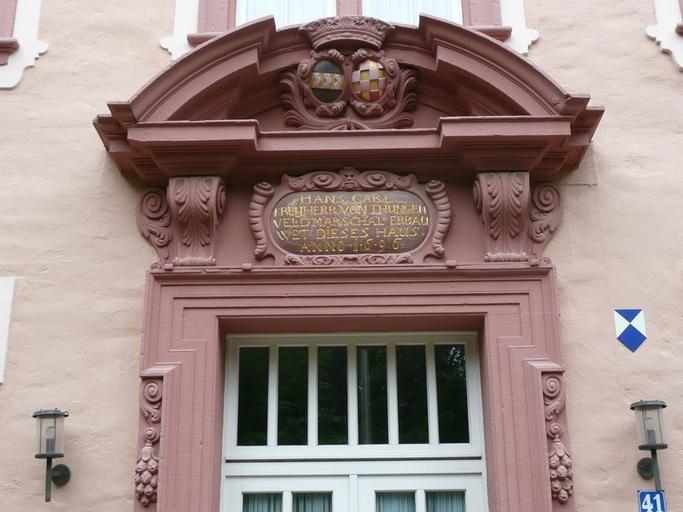 Keywords: Bad Ems Vier Tuerme.JPG Karlsburg called Vier Tuerme Built in 1606 by Hans Carl von Thüringen Architect Johann Christoph Sebastiani ; 1809/10 finished Portal detail with court of arms of H C von Thüringen Reliefs in Bad Ems Reliefs of coats of arms in Rhein-Lahn-Kreis |