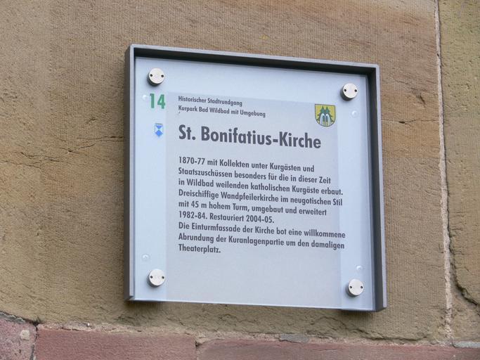 Keywords: Bad Wildbad Bonifatiuskirche außen Tafel.jpg Bad Wildbad Landkreis Calw Baden-Württemberg <br /> Katholische Pfarrkirche St Bonifatius<br /> Informationstafel own own photograph 2008-07 Photo Andreas Praefcke Panoramafreiheit; Public Domain Pfarrkirche St Bonifatius Bad Wildbad Photos by User AndreasPraefcke Signs in Bad Wildbad |