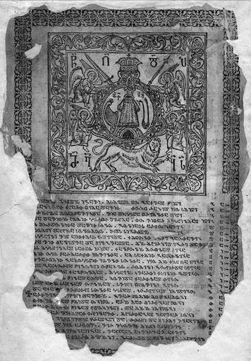 Keywords: Bagrationi COA (1709).JPG Commonist en Coat of arms of the Bagrationi dynasty from the Acts of the Apostles printed in Tbilisi in 1709 საქართველ ს პარლამე ტის ერ ვ ული ბიბლი თეკა ვახტა გ -ის სტამბის გამ ცემები 1709-1722 შემდგ დალი მაჩაიძე თბ 2009 1709 Author PD-old-100 1709 in Tbilisi Vakhtang VI Bagrationi dynasty coats of arms Asomtavruli letters |