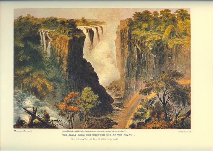 | Keywords: Baines4.jpg Title THE FALLS FROM THE WESTERN END OF THE CHASM From the Leaping Water and Three Rill Cliff to Garden Island <br> Additional text T Baines del_F Jones Lith London Published October 4th 1865 by Day Son Limited Lithographers Gate Street Lincoln's Inn Fields WC Day Son Limited Lith <br> Content Victoria Falls with rainbow cliffs trees and probably aloes scan from modern copy of colour print original publication 1865 uploaded to Commons 2006-09-21 Creator Thomas Baines as below See also Image Baines Herd of Buffaloes jpg Image Baines Falls by Sunrise col print jpg Image Baines Falls from the East col print jpg Image Baines Gt Western Fall col print jpg Image Baines Zanjueelah jpg Thomas Baines Victoria Falls in art 1865 PD-old |