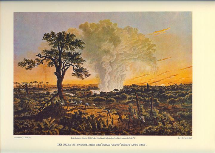 Keywords: Baines Falls by Sunrise col print.jpg Title THE FALLS BY SUNRISE WITH THE 'SPRAY CLOUD' RISING 1 200 FEET <br> Additional text T Baines delt_T Picken lith London Published October 4th 1865 by Day Son Limited Lithographers Gate Street Lincoln's Inn Fields WC Day Son Limited Lith <br> Content Victoria Falls with party of travellers Europeans are setting up a camera sketching and frying breakfast Africans are carrying loads including ribs and haunches of meat Different types of dress can be seen the white men are wearing shirt trousers and brimmed hats; some of the black men wear loincloths others shirt and trousers and their headgear includes head cloths and fez-like hats Three figures are resting or asleep two wrapped in blankets Two birds vultures sit in the tree overhead Palm and baobab trees are visible in the distance scan of modern copy of colour print original publication 1865 uploaded to Commons 2006-09-21 Creator Thomas Baines PD-old See also Image Baines Herd of Buffaloes jpg Image Baines Falls from the East col print jpg Image Baines4 jpg Image Baines Gt Western Fall col print jpg Image Baines Zanjueelah jpg Thomas Baines Victoria Falls in art 1865 paintings 1860s landscape paintings Africans in 19th-century art Loincloths in art