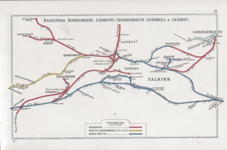 Keywords: Bainsford, Bonnywater, Carmuirs, Grangemouth, Greenhill & Larbert RJD 31.jpg Pre Grouping railway junction around Bainsford Bonnywater Carmuirs Grangemouth Greenhill Larbert Railway Junction Diagram and 1913 1914 Railway Clearing House Author died more than 70 years ago - public domain PD-old DEFAULTSORT 031 Railways Junctions Diagram 1914 001-040 Dunbartonshire RJD 1914 Stirlingshire RJD 1914 Caledonian Railway RJD Kilsyth and Bonnybridge Joint Railway RJD North British Railway RJD Larbert Grangemouth Greenhill Falkirk Bainsford |