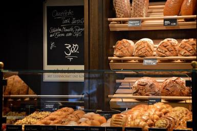 Keywords: bakery indoors bread shelves farmer's bread baked goods been award offers display case price tags glass reflection