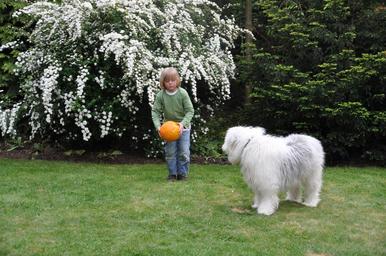 Keywords: ball dog boy play shoot bobtail child young fellig fun front yard garden meadow ball game tee