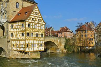 Keywords: bamberg town hall city view rottmeister cottage fachwerkhaus regnitz franconian architecture arch town on the river romantic island city hall bridge river building historically old town city water germany bavaria
