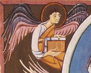 | Keywords: BambergApocalypseFolio010vWorshipBeforeThroneOfGod-DetailAngel.jpg Der Engel als Symbol für den Evangelisten Matthäus The Angel Bamberger Apokalypse Folio 10 verso Bamberg Staatsbibliothek MS A II 42 Folio 10 verso del Apocalipsis de Bamberg um 1000 Auftraggeber Otto III oder Heinrich II Author died more than 70 years ago - public domain PD-old Bamberg Apocalypse Angel of Saint Matthew in miniatures Angels with books | ||||
