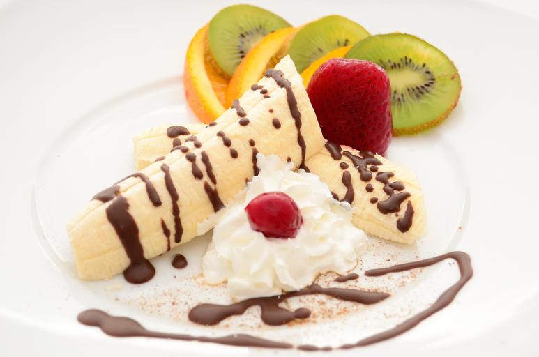 Keywords: bananas strawberries kiwi orange dessert ice cream fruit sweets whipped cream eating sweet dish the sweetness chocolate sweet pastries cocoa tube