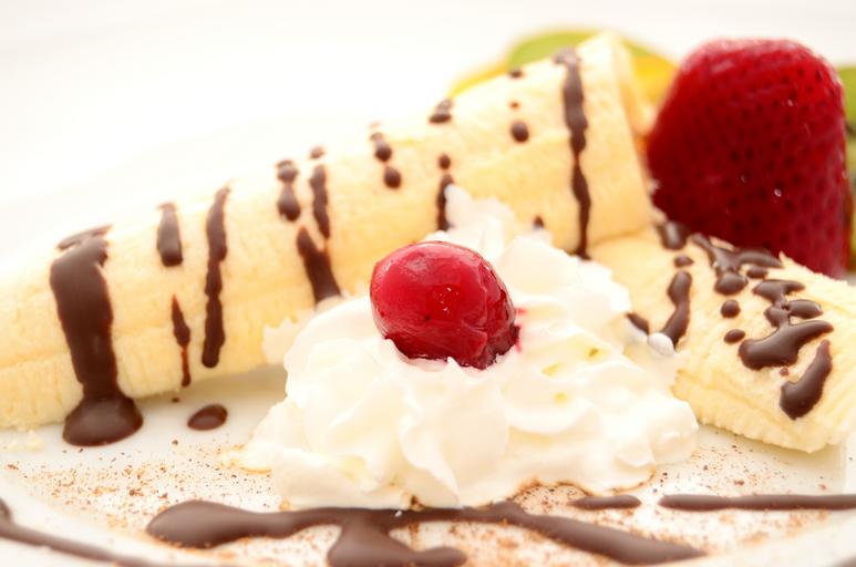 Keywords: bananas strawberries kiwi orange dessert ice cream fruit sweets whipped cream eating sweet dish the sweetness chocolate sweet pastries cocoa tube