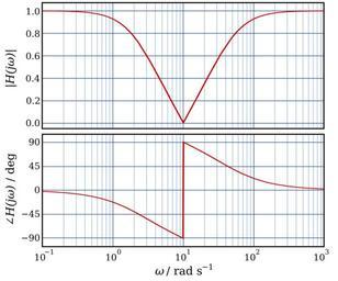 Keywords: Band-Reject Filter Response.svg en The frequency reponse of a bend-stop filter with transfer function <math>H j\omega \frac 100-\omega 2 100-\omega 2+40j\omega </math> This is not a Bode plot as the magnitude axis is not logarithmic Own Inductiveload 2009-01-05 Band-reject filters |