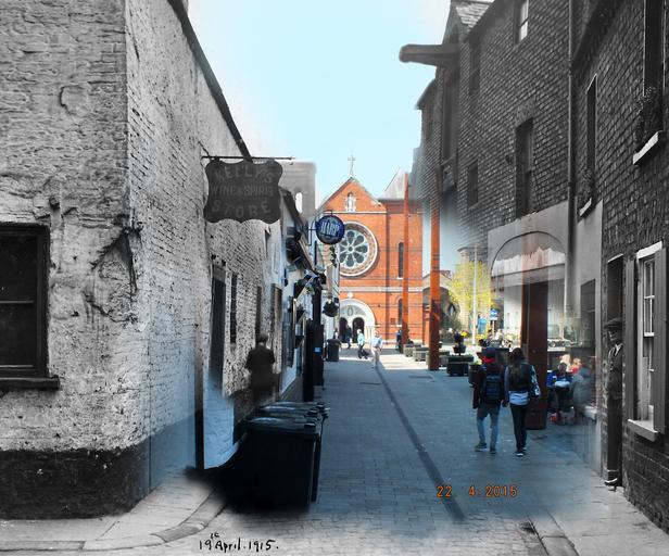 Keywords: architecture; belfast; public house; church architecturebelfastpublichousechurch belfast city corporation belfastcitycorporation road outdoor sidewalk Creator: Alexander Hogg Date: 19th April 1915 for the original photograph and 22nd April 2015 for the modern merged photograph. Original format: Photographic print. Description: Merged photograph showing Bank Street, leading to Chappel Lane, Belfast, with Kelly's Wine & Spirit Store in the foreground (now Kelly's Cellars) and St Mary's Church in the background. PRONI ref: LA/7/8/HF/4 Copying and copyright: Please see www.proni.gov.uk/index/research_and_records_held/copying_... For Copy Orders, contact: Email: proni@dcalni.gov.uk For fees and charges see: www.proni.gov.uk/index/about_proni/are_there_any_fees_and... Creator: Alexander Hogg Date: 19th April 1915 for the original photograph and 22nd April 2015 for the modern merged photograph. Original format: Photographic print. Description: Merged photograph showing Bank Street, leading to Chappel Lane, Belfast, with Kelly's Wine & Spirit Store in the foreground (now Kelly's Cellars) and St Mary's Church in the background. PRONI ref: LA/7/8/HF/4 Copying and copyright: Please see www.proni.gov.uk/index/research_and_records_held/copying_... For Copy Orders, contact: Email: proni@dcalni.gov.uk For fees and charges see: www.proni.gov.uk/index/about_proni/are_there_any_fees_and... |